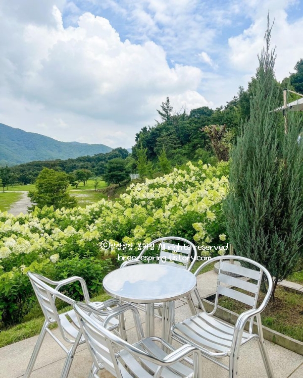 남양주 비루개 카페는 서울에서 차로 40분쯤 달리면 닿는 수국 정원 속 작은 숲속 쉼터예요. 서울근교 드라이브 카페로 수국이 가장 화려하게 피는 7월 말부터 8월 초 사이엔 주차장이 금세 차니 되도록 이른 시간에 도착하는 게 좋아요. 반려견 동반이 가능했고, 야외 테이블도 많아서 꽃과 함께 천천히 시간을 보내기에 딱이었죠. 입구를 지나 정원 안으로 들어서면 유럽풍으로 연출된 수국 화단 사이를 거닐 수 있었고, 중간중간 놓인 작은 의자와 포토존이 드라이브 끝 추억을 더해줍니다.