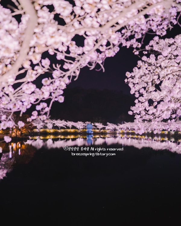 호수 주변을 따라 걷다 보면 벚꽃나무 가지가 낮게 늘어져 있어, 손을 뻗으면 꽃잎이 닿을 듯 가깝다. 곳곳에 벤치가 놓여 있어 여유롭게 앉아 꽃길을 감상하는 사람들도 많다. 물가에 가까운 길에서는 잔잔한 호수 위로 꽃잎이 떠다니는 모습을 볼 수 있는데, 바람이 살짝 불 때마다 수면 위로 퍼지는 꽃잎이 마치 작은 파도를 만드는 것 같다. 야경이 아름답기로 유명한 곳이라 해가 질 무렵 방문하면, 낮과는 또 다른 감성을 느낄 수 있다.