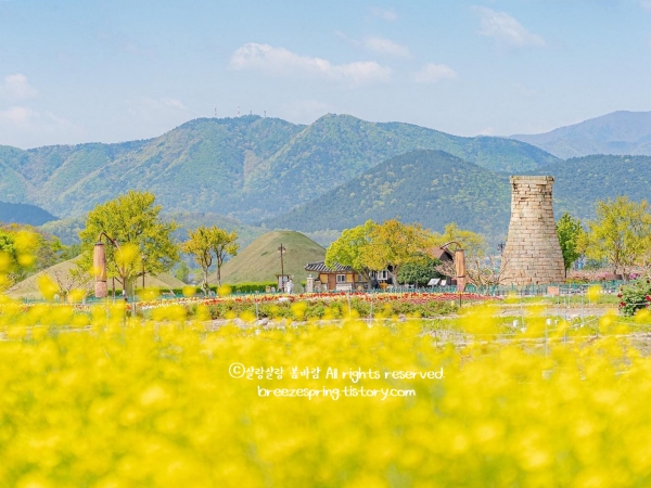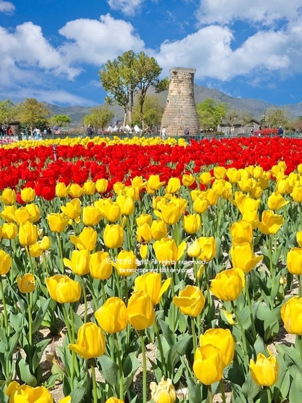 경주의 봄은 첨성대 주변에서 가장 선명하게 드러난다. 3월 말이면 노란빛을 띠기 시작한 유채꽃이 빠르게 번져나가고, 4월이면 넓은 들판이 완전히 봄의 색으로 물드는 경북 가볼만한곳 베스트 10이다. 한 구역에만 피어 있는 것이 아니라, 첨성대를 중심으로 길게 이어지는 꽃밭이라 어디서든 그 화사함을 마주할 수 있다. 여기에 더해 붉고 분홍빛을 띠는 튤립까지 가세하면서 색의 대비가 더욱 뚜렷해진다. 멀리서 보면 그림처럼 보이지만, 안으로 들어가면 마치 꽃 사이에 잠긴 듯한 느낌이 행복하기만 하다.