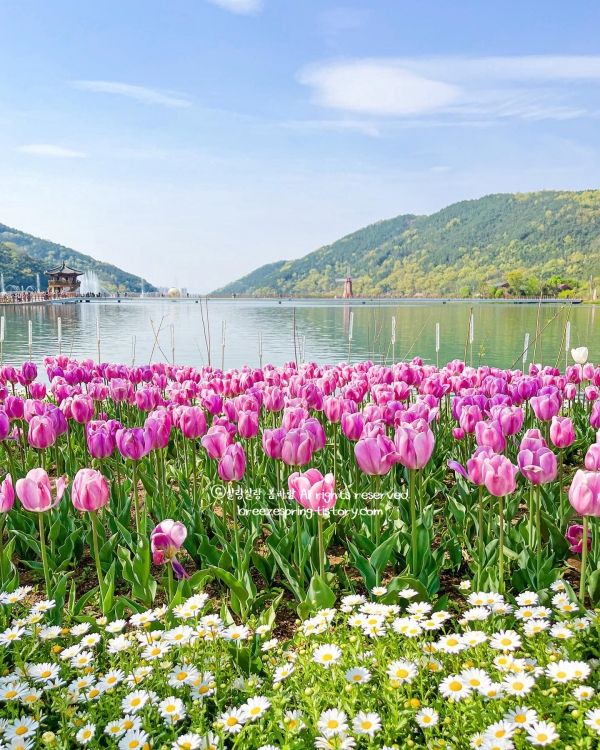 옥연지를 품고 있는 송해공원은 벚꽃과 튤립이 한자리에서 만나는 봄에 경북 가볼만한곳 베스트 10이다. 3월 말이 되면 호수를 따라 벚꽃이 피어나고, 그 아래로 튤립들이 색을 더해 활기찬 봄 풍경을 만들어낸다. 송해공원의 벚꽃길은 길게 이어져 있어 걷는 동안 색이 달라지는 모습을 볼 수 있고, 튤립은 원색적인 색감이 선명해 벚꽃과 묘한 대비를 이룬다. 공원 한쪽에는 송해 선생을 기리는 동상과 방송 테마 공간이 마련되어 있어, 꽃 구경과 함께 가볍게 둘러보기에도 좋다. 호수 주변을 따라 데크길이 조성되어 있어, 벚꽃이 반영된 물빛을 감상하며 산책하기에도 좋은 장소다.