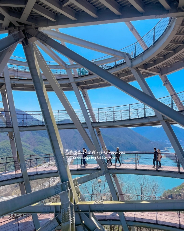 만천하스카이워크는 단양 여행에서 그냥 들르는 단양 갈만한곳 베스트 10곳이 아니라, 진짜 단양을 내려다보는 순간을 만나는 곳이에요. 전망대 위에 올라서면 단양강이 시원하게 휘감아 돌고, 그 너머로 단양을 둘러싼 산맥이 겹겹이 펼쳐지는데 — 맑은 날엔 강, 산, 하늘이 다 따로 또 같이 빛나요. 마치 한 장의 거대한 파노라마 안에 들어간 기분이에요.