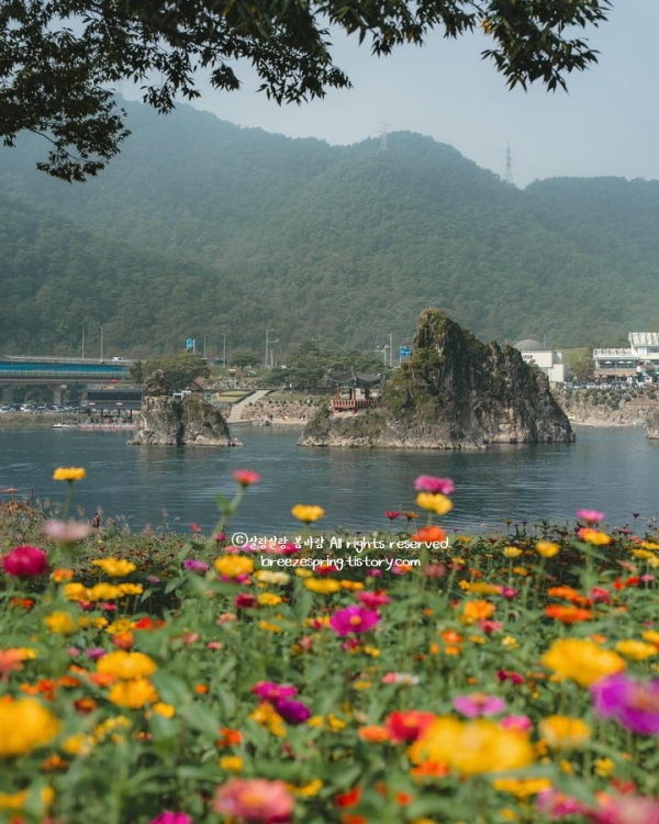 도담삼봉 자체는 입장료 없지만, 주차는 3,000원 정도고요. 튤립이 피는 봄철엔 꽃까지 어우러져서 훨씬 화사한 분위기예요. 사진 찍는 각도에 따라 느낌이 조금씩 달라지는데, 물가 쪽 데크나 전망대 올라가서 찍으면 프레임이 진짜 잘 잡혀요.