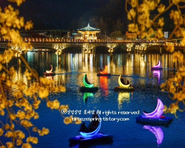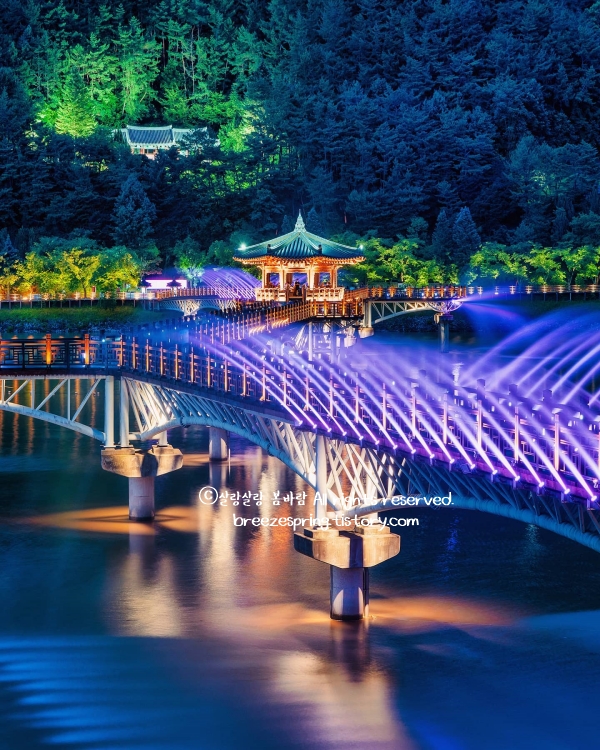 밤에 가야 진짜 얼굴을 볼 수 있는 다리다. 387m로 국내에서 가장 긴 목책교인 월영교는, 해 질 녘 조명이 켜지기 시작하면 낙동강 수면에 빛이 반영되며 말로 표현하기 어려운 장면을 만들어낸다. 이 다리의 이름과 형태 안에는 슬픈 이야기가 숨어 있는데, 조선시대 이응태의 아내가 먼저 세상을 떠난 남편을 위해 자신의 머리카락으로 한 켤레 미투리를 만들었다는 사연에서 비롯됐다. 다리 중간에 있는 월영정 정자에 잠시 앉아 물을 바라보고 있으면, 그 이야기가 괜히 더 실감나게 다가온다. 안동 가볼만한곳 야경 포인트로 SNS에 끊임없이 등장하는 이유가 충분히 납득된다.