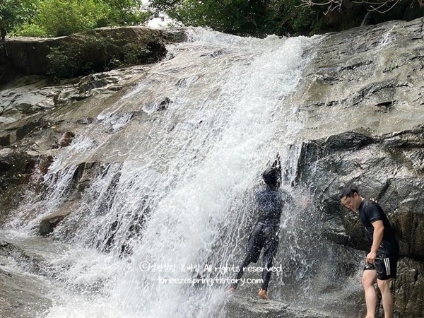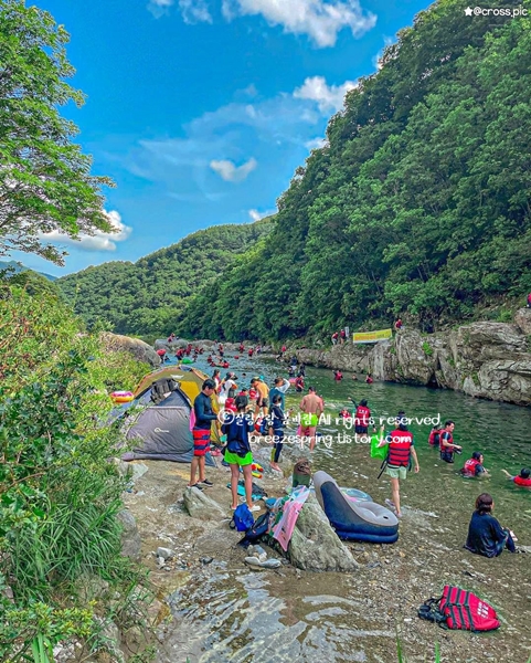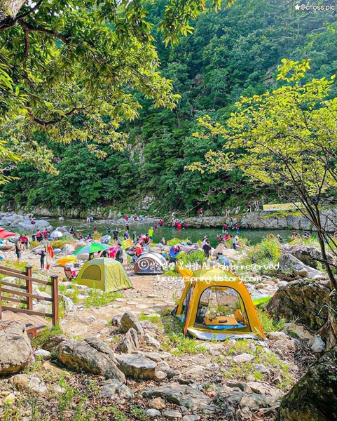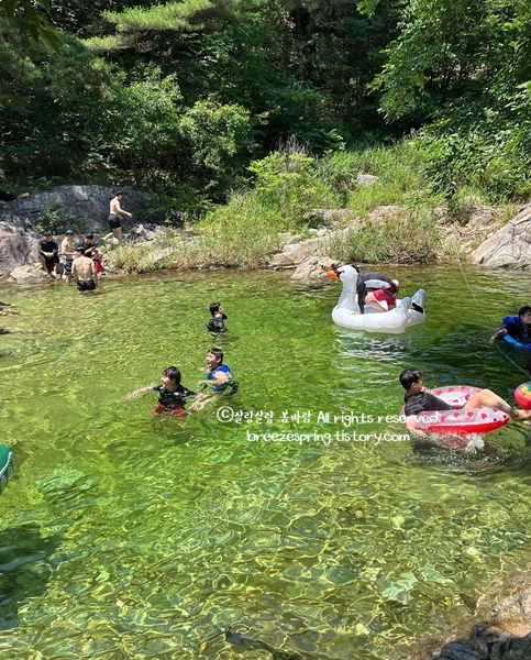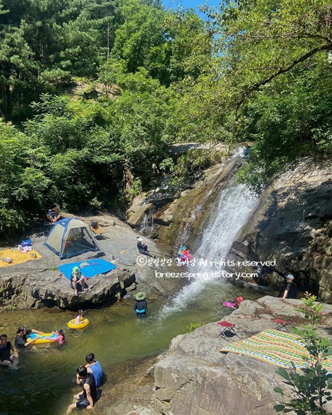 주소를 찍고 가면 마을에서 관리하는 주차장 도착하고 종일 주차로 주차 비용을 1만원씩 받고 있으며 계곡 폭포로 가시려면 주차를 하시고 이정표를 따라 살짝 걸어가야 합니다. 계곡 앞으로 도착하면 자리가 쭉 있고 간단하게 돗자리 사용으로 캠크닉으로 즐기기에 좋습니다.