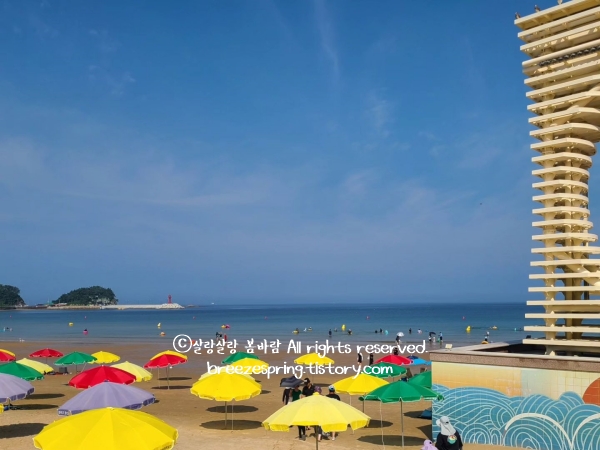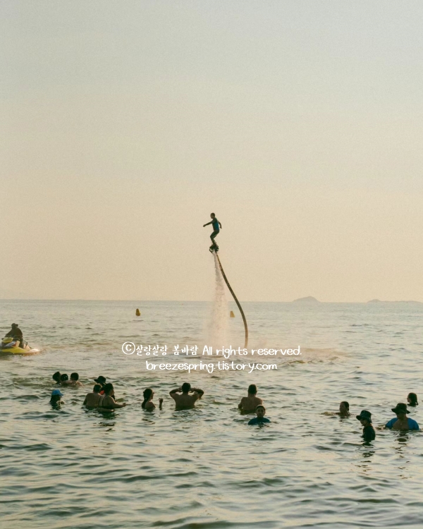 분수대 앞쪽에는 코인 노래방이나 조개구이집도 줄지어 있었고, 해가 질 무렵엔 조용히 앉아 바다 바라보며 노을 기다리는 사람들 틈에 섞여 있었어요. 야간개장이 열리는 8월 13일부터 17일 사이엔 드론 라이트쇼랑 트로트 공연이 열린다 해서 그 시기에 맞춰 가는 것도 괜찮겠고 사람은 많은데 해변이 넓어서 답답하지 않았고, 발 밑으로 시원하게 퍼지는 모래가 그날의 더위를 잊게 해줍니다.