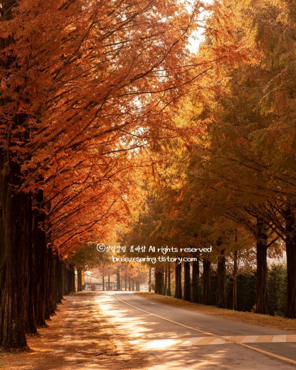 영화 '국가대표'와 다양한 광고의 배경이 되었던 부귀 메타세쿼이아길은 약 1.5km 길이로 길게 뻗은 이국적인 가로수길입니다. 사계절 내내 각기 다른 색채를 뽐내며 드라이브의 낭만을 더해주는데, 차에서 내려 나무 사이로 비치는 햇살을 받으며 걷다 보면 일상의 피로가 눈 녹듯 사라지는 기분을 느끼게 됩니다.