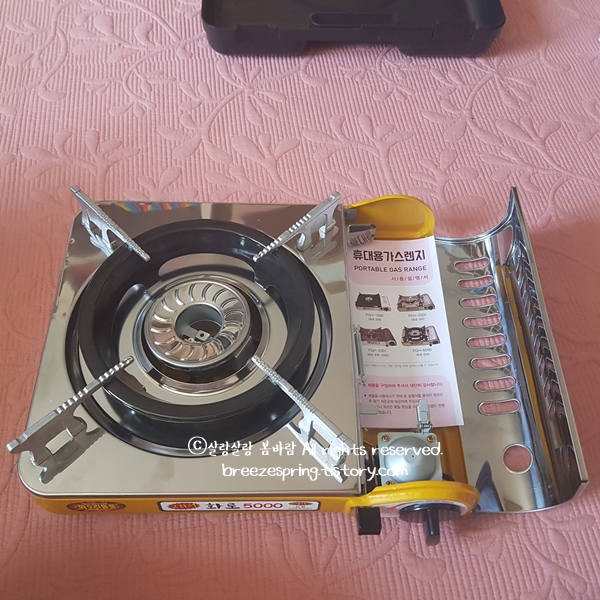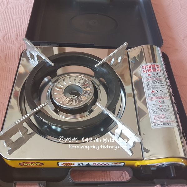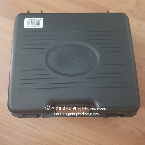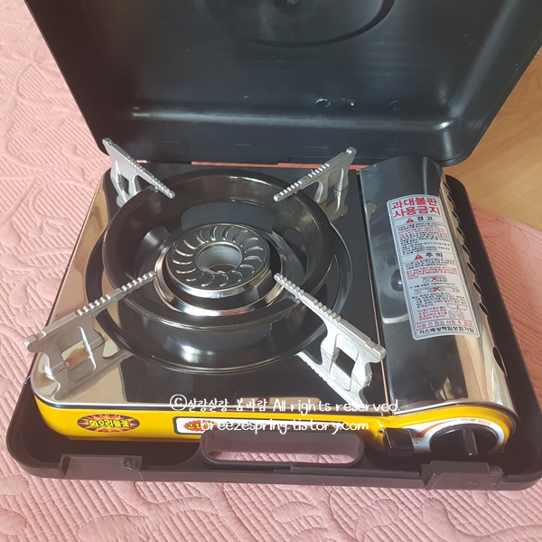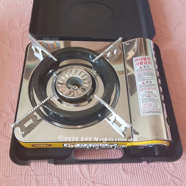 그리고 다른 휴대용 가스렌지는 판을 뒤집어야 케이스에 들어가던데 지금 쓰는 제품이 그렇습니다. 사용하고 나서 뒤집어야 케이스에 들어가죠. 그런데 이 제품은 그냥 저렇게 놓아도 케이스가 닫힙니다. 사용 후 케이스 넣고 닫으면 끝입니다.
