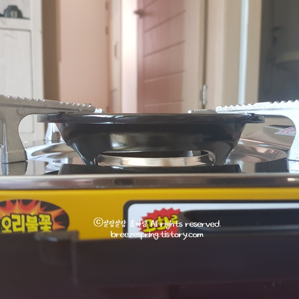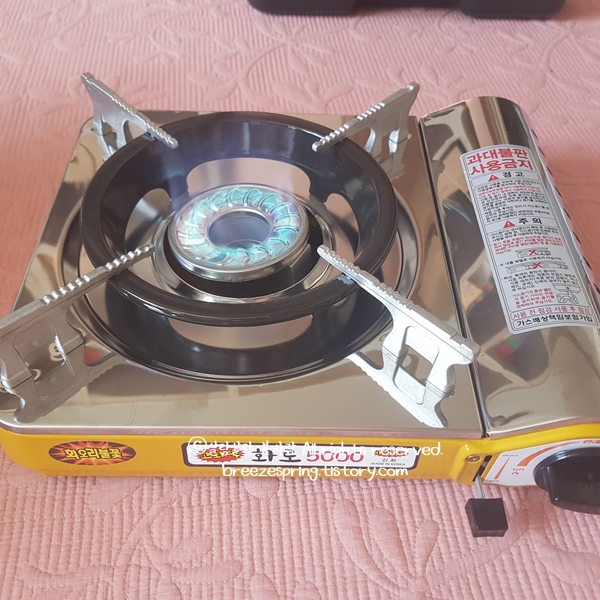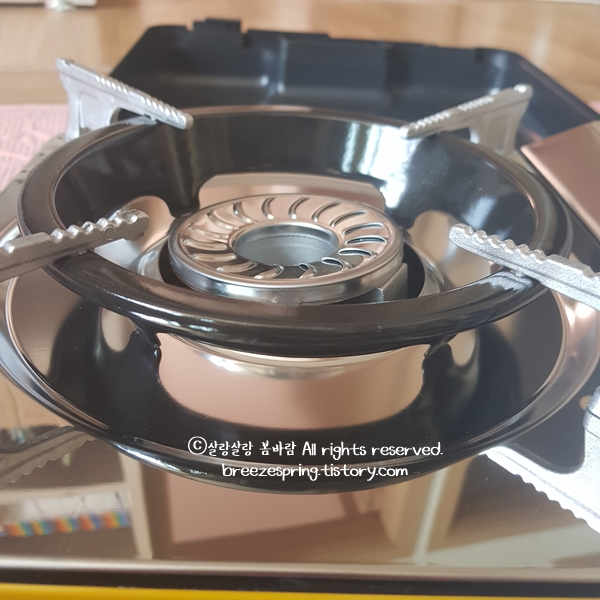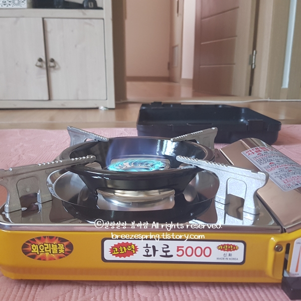 회오리 불꽃이 보이시나요? 화력이 센 것은 물론이고 바람막이가 있어서 캠핑용 가스렌지로는 최고입니다. 처음에 2구짜리 버팔로 제품을 사려고 했는데 사실 화력이 얼마나 좋은지는 확인도 안 했지요. 2구짜리에 그냥 마음이 혹했던 것입니다. 생각해보면 휴대용 가스버너에서 중요한 것은 화력과 바람막이, 안전성 이 세가지인 것 같습니다. 이번에 구매한 제품이 이 모든 면을 충족시켜 주었네요. 2구짜리 사려다가 요거 샀는데 아주 만족스럽습니다.