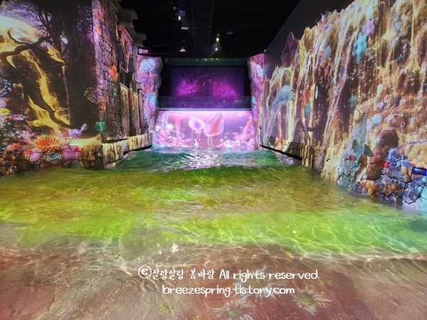 제주도 부모님 겨울 여행 코스 워터월드 제주는 겨울에도 맨발로 물길을 걷는다는 게 신기했어요. 입구에서 아쿠아 슈즈를 받아 신고 들어서면 따뜻한 실내에 시원하게 흐르는 물길이 이어지는데, 조명이 비치는 바닥을 따라 천천히 걸으면서 자연스레 사진을 찍게 되더라구요. 각 구역이 조명이나 분위기가 조금씩 달라서 다음 코너가 궁금해지는 느낌도 있었고요. 미디어아트존 쪽은 아이들보다 어른들이 더 좋아합니다.