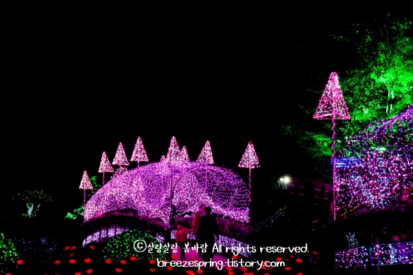 낮과 밤의 색이 달라지는 포천 허브아일랜드에요. 낮에는 핑크모래언덕에서 썰매(6천원) 무제한을 즐기고 밤에는 반짝반짝 예쁜 불빛들로 꾸며진 허브 아일랜드를 볼 수 있어요. 산타마을이 낮에는 허전해보였는데 밤이되면 화려하게 돌변하는 모습이 이색적이었어요!