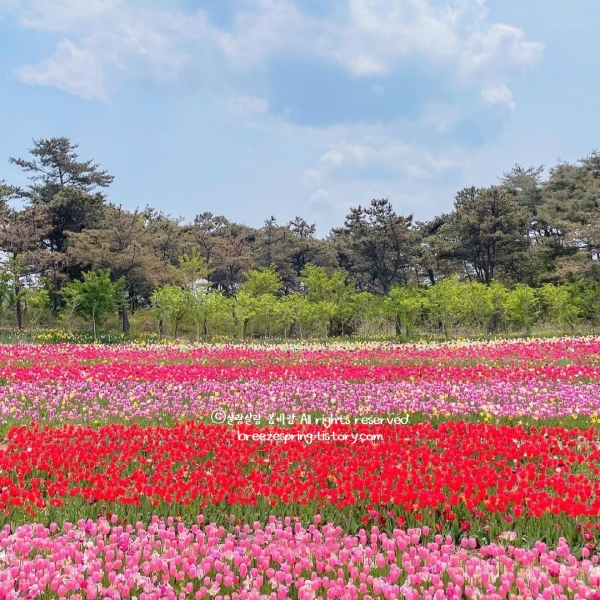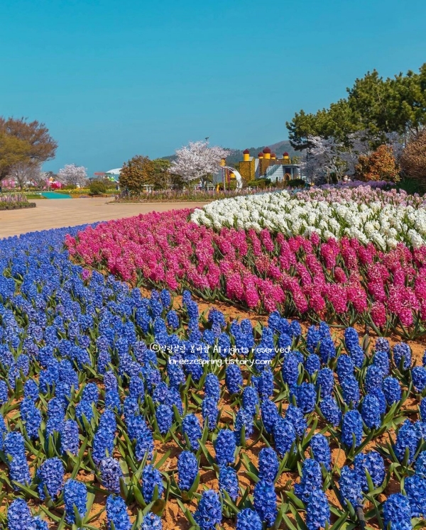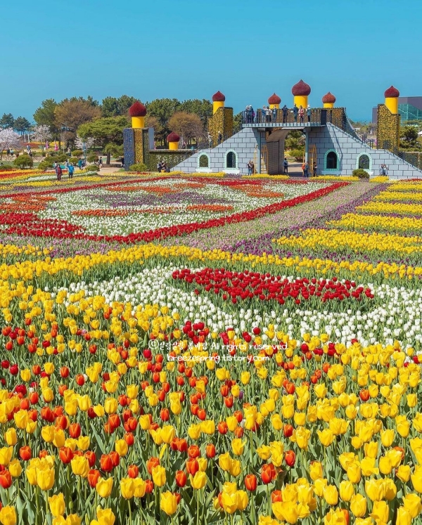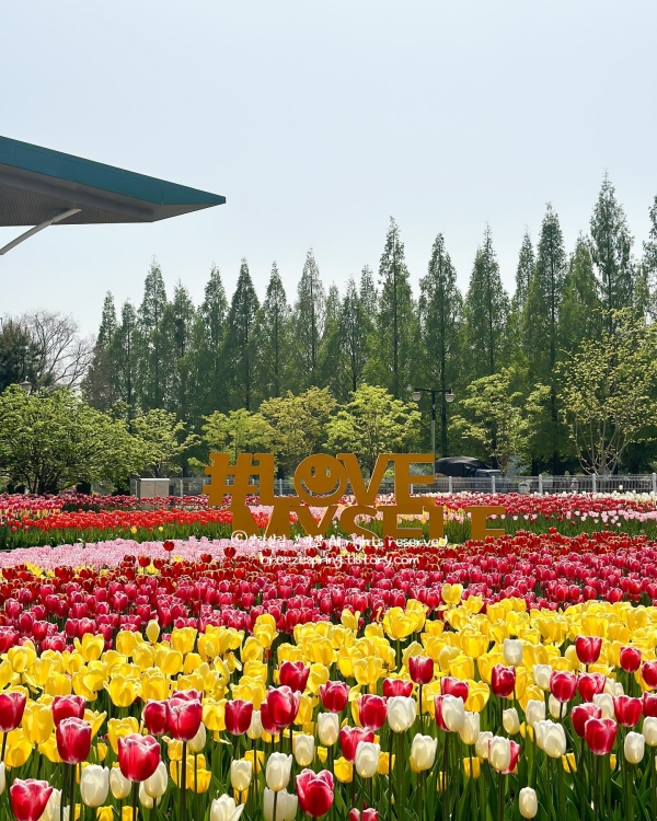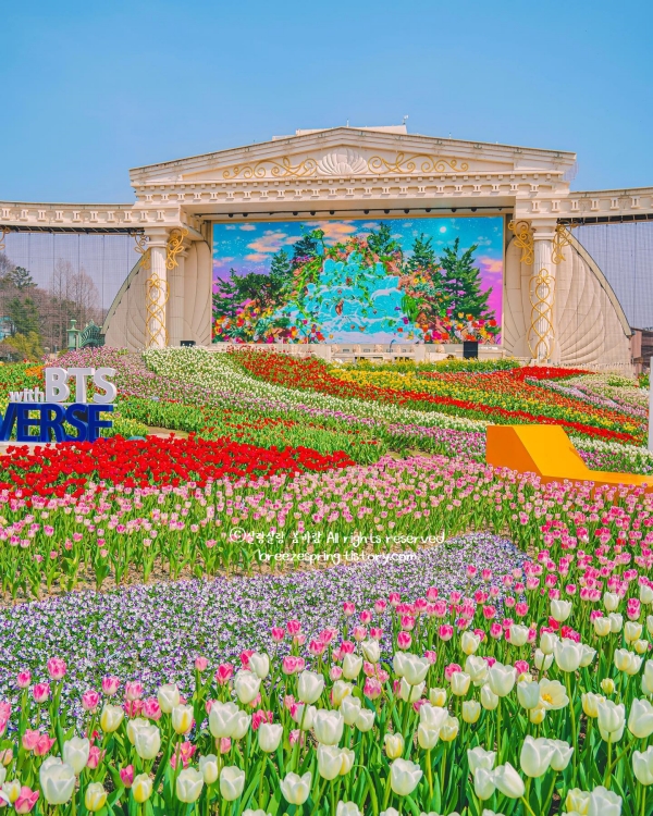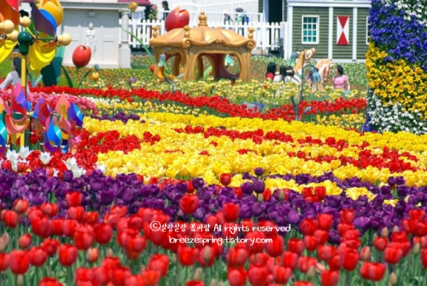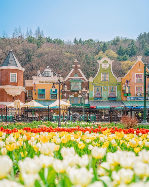 정원은 여러 구역으로 나뉘어 있지만 동선이 자연스러워 천천히 산책하듯 걷기에 좋은 서울근교 4월 봄꽃축제 하는 곳이다. 튤립이 심어진 구역 너머로는 롤러코스터와 대형 놀이기구가 보이는데, 그 대비가 묘하게 재미있다. 날씨가 맑은 날에는 야외 공연도 함께 펼쳐져 걷는 시간이 지루하지 않다.