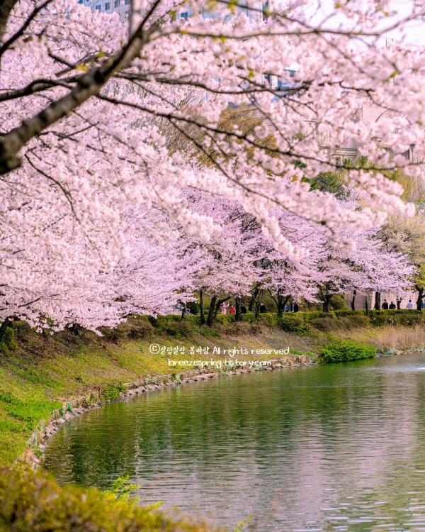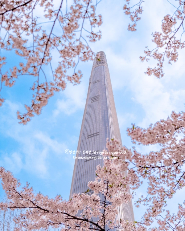 벚꽃은 4월 초 서울 전역에서 피기 시작하는데, 석촌호수는 그중에서도 가장 넓은 호숫길을 따라 벚꽃이 이어지는 서울 4월 봄꽃축제 하는 곳이다. 호수를 따라 도는 데 1시간 남짓 걸리며, 벚꽃이 물가 바로 위로 늘어져 있어 걷는 동안 시선이 자연스럽게 아래를 향하게 된다.