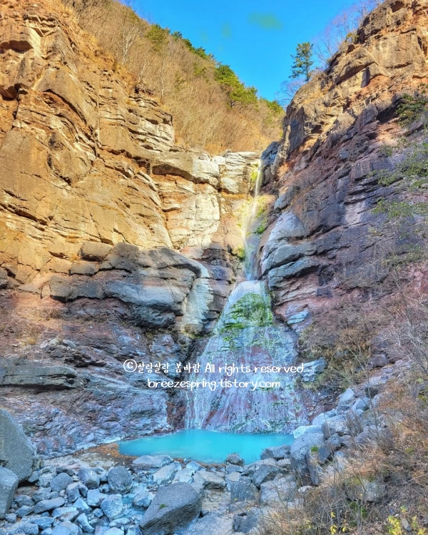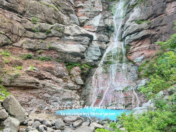 다만 폭포로 내려가는 길은 꽤 가파르고 계단도 길어요. 편한 신발은 필수고, 여름 한가운데, 이토록 오묘한 색의 계곡에서 물멍하다 보면 마음까지 투명해지는 경험, 미인폭포에서 가능합니다.