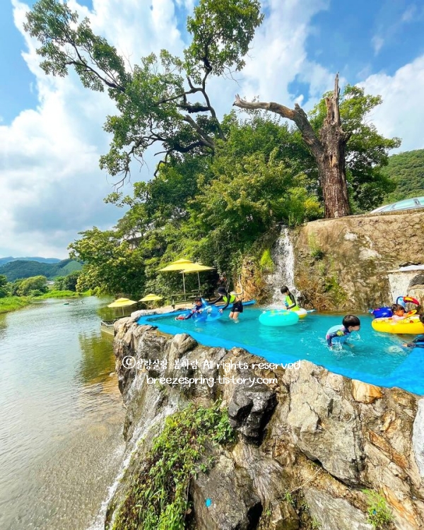 강원도 횡성의 '숲속의 하루'는 정말 이름처럼, 숲과 계곡 사이에 딱 하루만 있어도 힐링이 저절로 되는 마법 같은 곳이에요. 바위 절벽 아래로 맑은 물이 흐르고, 노란 파라솔 달린 뗏목이 동화책 속 장면처럼 떠 있는 풍경은 숨을 멈추게 할 만큼 예쁩니다. 계곡 옆에 수영장이 붙어 있는 독특한 구조 덕에 아이들은 신나게 물놀이를 하고, 어른들은 시원한 커피 한잔 내려놓고 물멍하며 쉴 수 있는 최고의 7월 가볼만한 여행지 여름 피서지죠.