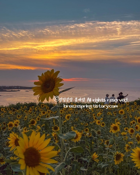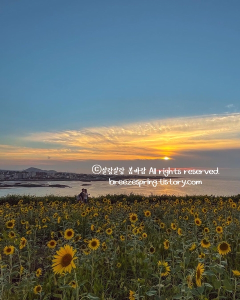 노을질 때가 가장 예쁜 서우봉에 해바라기가 핍니다. 해질녘 천천히 올라가면 많이 덥지 않고 좋습니다. 역대급 노을을 만난다면 8월 여행 중 지금 제주도 가볼만한곳 가장 행복하고 좋은 시간을 만나게 되는 곳입니다. 서우봉에서 바로본 풍경과 파도 소리, 귀뚜라미 소리도 힐링 그 자체입습니다.